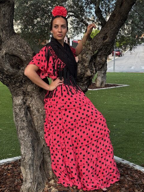 MOD. MARIA VOLANTITOS BASICO, CORAL CON LUNARES NEGROS MANGA 3 VOLANTES